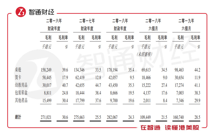 隽思提供的产品包括桌游卡片(纸牌游戏、纸板游戏及拼图)、贺卡(日常贺卡及季节性贺卡)、幼教产品(课堂学习用具及活动书籍)以及包装彩盒,核心产品主要为桌游及贺卡,这两项产品往年收入贡献基本都超过了80%。近三年,桌游、贺卡、幼教产品及包装彩盒收入复合增长率分别为12.16%、16.5%、29.1%及11.8%。