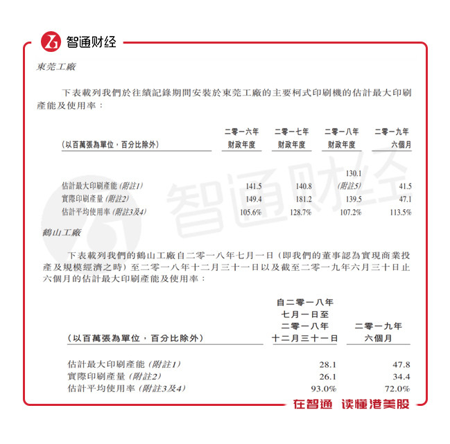 东莞工厂的使用率非常高,基本都是满负荷运行,往年使用率都超过100%,上半年实际印刷产量4710万张,产能使用率达113.5%,而鹤山工厂于2018年7月开始投产运作,上半年的使用率为72%,产能还未能充分释放。天津工厂之所以关闭,或与使用率低下有关,从往年看,天津工厂使用率不足70%,2018年仅为46.8%。