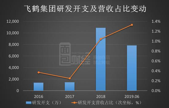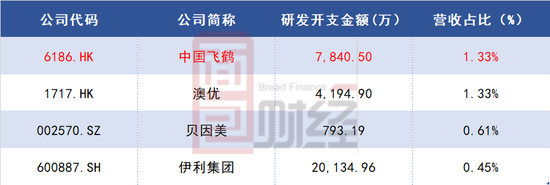 整理公开信披数据,除雅士利及蒙牛两家公司未披露研发开支具体金额外,飞鹤与主要上市乳企2019上半年的研发开支及占比情况如下: