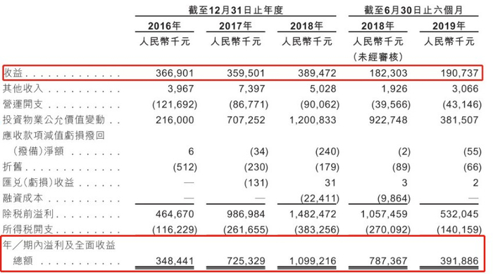 于2016-2019年上半年,这五处物业分别实现租赁收益总额3.19亿元、3.03亿元、3.25亿元及1.60亿元,同期取得物业收益总额2.46亿元、2.74亿元、3亿元以及1.48亿元。