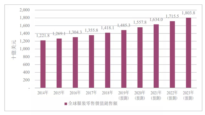 全球服装零售业于2014年至2018年呈现稳定增长,复合年增长率约为3.6%,零售价值总额达约14181亿美元。预期于2019年至2023年经历更快速增长,复合年增长率约为5.0%整体零售价值达约18038亿美元,主要归因于全球经济随着消费者收入增加而复苏。