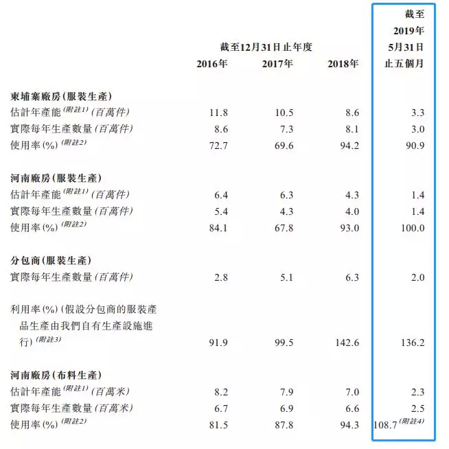 充足订单下,公司产能利用基本处于超负荷状态,部分业务还交给了分包商。自2018年第四季度及直至最后实际可行日期,公司已经收到该客户逾30份的订单,订购超过60万件睡衣产品。再加上原本大客户的持续稳定业务,公司服装生产方面,柬埔寨厂房的利用率高达90.9%,河南厂房使用率为100%,部分还交给了分包商,如果该部分业务由公司自己生产的话,公司产能利用率将达到136.2%,此外公司的河南布料生产产能108.7%的使用率,也是超负荷状态的。