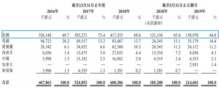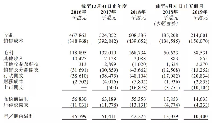 招股书显示,2016年-2019年前5个月,捷隆控股实现收入分别为4.68亿港元、5.25亿港元、6.08亿港元以及2.15亿港元;同期的净利润分别为0.46亿港元、0.51亿港元、0.42亿港元以及0.10亿港元,整体显示公司的营业规模并不大,同时经营虽然增长但相对缓慢。