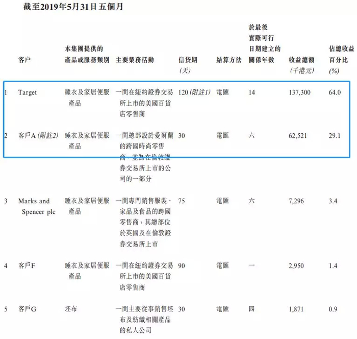 截至2018年12月31日止三个年度以及截至2019年5月31日止五个月,我们的总收益来自五大客户的收益分别约为458.7百万港元、509.6百万港元、594.0百万港元及211.9百万港元,分别占我们同期的总收益约98.0%、97.0%、97.6%及98.8%。其中Target、客户A及Marksand Spencerplc与本集团建立了介乎六至14年的长期业务关系。