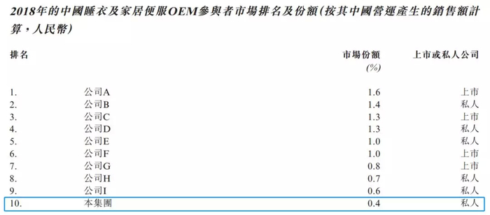睡衣和家居服的OEM制造商竞争激烈,2018CR10仅有10.1%。公司排在第十位,占比0.4%。