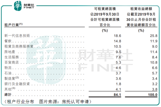 从房托认可申请中数据来看,五项物业的租户数量较多,租金贡献分散,租户类型也呈多样化。于2019年9月30日,该五项物业共有279个租户。前五大租户每月基本租金贡献占总额的18.5%。五大租户所处行业包括房地产、科研及技术服务、石油、物流以及医疗器械制造等。