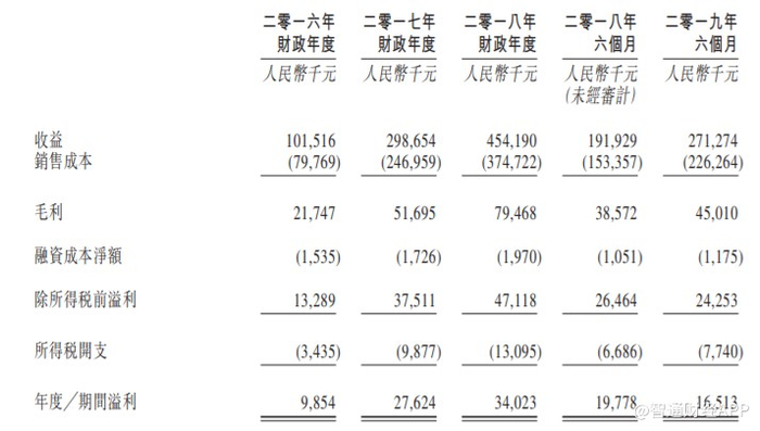 招股书显示,2016至2018年及2019年前6个月,公司实现营收分别为1.02亿元、2.99亿元、4.54亿元及2.71亿元,2016至2018年营收复合增长率为110.97%。毛利分别为2174.7万元、5169.5万元、7946.8万元及4501万元;年/期内溢利分别为985.4万元、2762.4万元、3402.3万元及1651.3万元。
