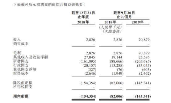 于往绩记录期,企业收入主要包括与授权产品有关的预付款及里程碑付款。于2018年,企业取得收入人民币283万元。截至2018年及2019年前九个月,分别录得收入人民币283万元及人民币7088万元。