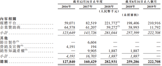 综艺节目,首先在于品牌营销的价值,广告招商为收入核心,顶级综艺节目招商能够达到数亿人民币级别。因此,稳定的节目产出能力和盈利能力打造了煜盛文化的核心竞争力。2016年,公司来自媒体平台的收入仅占总收入的46.2%,2019年首八个月该比例大幅提升至94.7%,这一趋势显示公司制作的优质内容逐渐被市场充分接纳、获资本另眼相看以及平台的积极采购。
