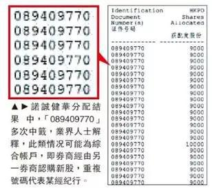 申报方式五花八门,令《上市规则》中的要求形同虚设。于披露易配售结果中,亦常见全页同一号码,获配不同数量的新股,例如今次诺诚健华的分配结果中,号码‘089409770’多次中签。宓光辉解释,此类情况可能为综合账户,即券商经由另一券商认购新股,重复号码代表某经纪行;另有可能为代理人账户,即券商应客户要求,将其数人的认购集合于同一帐户背后,可提供匿名的效果。