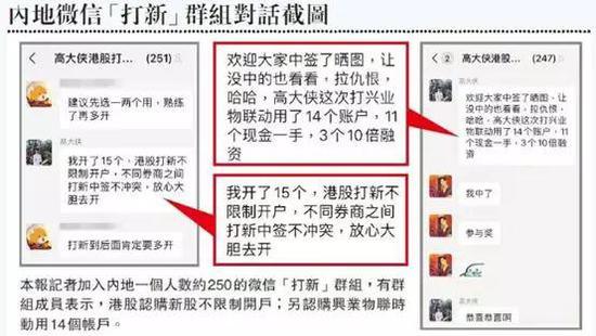 有见此漏洞在十多年来依然存在,内地散户更大肆宣扬并呼吁来港违规抽新股。本报记者加入内地一个人数约250的微信‘打新’群组,有不少人均在群组内‘晒’出成功重复认购的记录,讨论涉及新股包括九毛九(09922.HK)、兴业物联(09916.HK),热门股份几乎无一幸免,例如早前挂牌的烨星集团(01941.HK),一手中签率只有3%,但有群组成员更透过一人多户的方式,声称抽中3手。群组内更有自称券商工作人员的成员,宣扬此类做法,劝说新用户多开帐户。