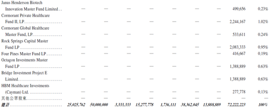 其他投资者包括:新加坡GIC Private Limited、淡马锡旗下Pavilion Capital(兰亭投资)、Shanhe Holding Co., Limited(嘉善国投)、Janchor Partners(建峖实业投资)、RA Capital、Hillhouse(高瓴资本)、Decheng Capital (德诚资本)、GT Fund(国新国同)、BlackRock(贝莱德)、Janus Henderson Investors(骏利亨德森投资)、Cormorant、Rock Springs Capital、Octagon Capital(八方资本)、HBM Healthcare Investments。