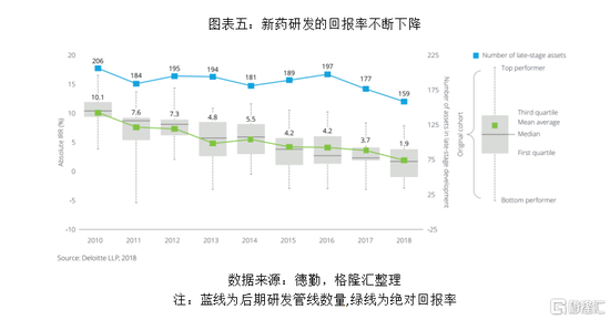 注:蓝线为后期研发管线数量,绿线为绝对回报率