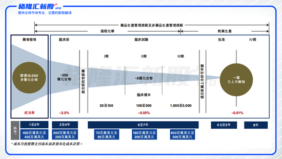 通常而言,新药研发的周期包括早期的药物发现,临床前研究,再通过临床的I/II/III期试验,最后上报相关监管机构获得批准,最终得以上市销售。根据康龙化成的招股书中披露,基本上一个新药从开始研发到获批通常需要10年以上时间,花费的金额也超过10亿美元。