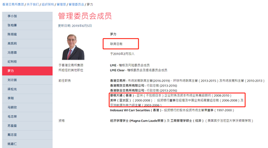此外,有媒体表示,港交所联席总裁罗力也要离职。据新浪港股获悉,罗力并没有打算离职。港交所资料显示,今年56 岁的罗力于2010年 2月加入港交所,现职联席总裁,并为伦敦金属交易所(LME)稽核及风险委员会成员、LME Clear稽核委员会及提名委员会成员。
