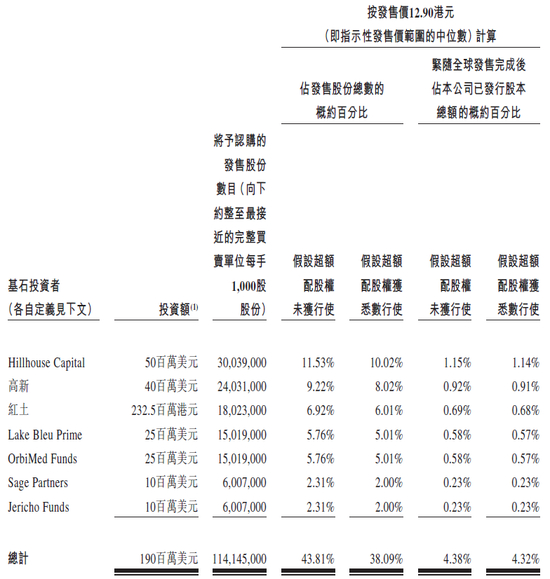 基石投资者方面,公司已与多名基石投资者订立若干基石投资协议:Hillhouse Capital(高瓴)、高新、红土、Lake Bleu Prime(清池)、OrbiMed Funds(奥博)、Sage Partners、Jericho Funds认购额分别为5000万美元、4000万美元、2.325亿港元、2500万美元、2500万美元、1000万美元及1000万美元。