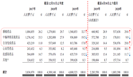 公司产品主要聚焦于肿瘤疾病、中枢神经系统疾病、自身免疫疾病三大领域,这三大领域的收入占比约70%。