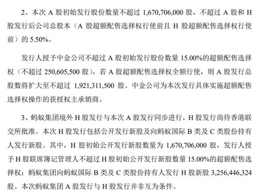 根据A股招股资料,蚂蚁A股将发行不超过16.7亿股,不超过发行总股本的5.5%。如计及超额配售权,发行数量将扩大至不超过19.21亿股。另外,蚂蚁H股将发行16.7亿股新股,与A股一样,同样设有约15%的超额配售权,而蚂蚁将向蚂蚁国际的B类及C类股份持有人,发行约32.56亿股H股。