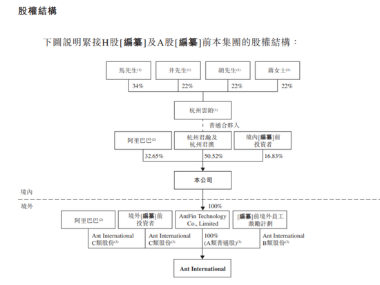 虽然阿里巴巴的创办人马云于8月18日将旗下的杭州云铂的66%股权,平均转让予蚂蚁执行董事长井贤栋、首席执行官胡晓明及非执行董事蒋芳,三人各占22%股权,马云只保留34%股权,惟4人签订一致行动协议,马云对杭州云铂持有决议的控制力,故实际控制蚂蚁50.52%股份,对蚂蚁有最终的控制权。
