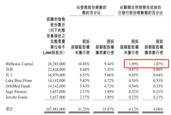 公司已与多名基石投资者订立若干基石投资协议:Hillhouse Capital(高瓴)、高新、红土、Lake Bleu Prime(清池)、OrbiMed Funds(奥博)、Sage Partners、Jericho Funds认购额分别为5000万美元、4000万美元、2.325亿港元、2500万美元、2500万美元、1000万美元及1000万美元。紧随上市后,高瓴资本持股1.09%。