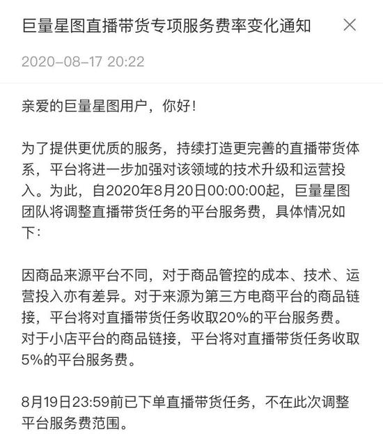 直播带货方面,8月20日抖音直播带货专项服务费率新规实施后,对于来源是抖音自己开发的电商平台——抖音小店的商品链接,平台对直播带货任务收取5%的平台服务费,对于来源是第三方平台商家的商品链接,收取20%的平台服务费。