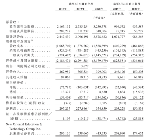 聆讯文件中披露了公司自2018至2020近三个财年的财务数据,分别营收24.47亿美元、30.96亿美元、35.79亿美元;净利润方面,最近三个财年分别为2.97亿美元、2.28亿美元、3.55亿美元。截至2020年8月31日止的2021财年第一财季,新东方的净利润1.51亿美元。