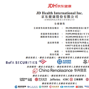 京东健康(06618.HK)发布公告,将于11月26日-12月1日招股,公司拟发行约3.82亿股股份,其中公开发售1909.5万股,国际发售约3.63亿股,每股发行价不超过70.58港元,每手50股,预期将于12月8日上市。
