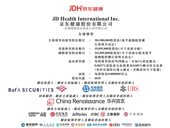 11月25日,据彭博社报道,京东健康计划在香港上市中募资至多35亿美元。京东健康将发行3.819亿股,发行价指导区间在62.8港元至70.58港元。美国银行(Bankof America)、海通国际(Haitong International)和瑞银集团(UBS)是京东健康IPO的联合承销商。