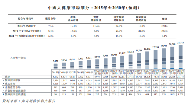 根据弗若斯特沙利文报告,2019年中国大健康行业的市场规模达到人民币8.13万亿元,预计2030年将增至人民币21.77万亿元,复合年增长率为9.4%。