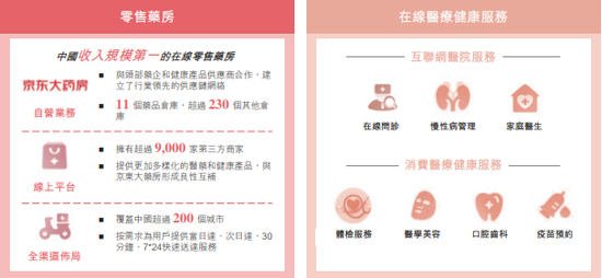 目前的京东健康旗下拥有零售药房及在线医疗健康服务。若按照2019年按收入计,京东健康的零售药房是中国最大的在线零售药房。