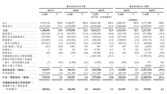 2017年至2019年,京东健康的总收入分别为56亿元、82亿元、108亿元,2020年上半年为88亿元。剔除公允价值变动和非经常损益项目,京东健康在2017年至2019年的净利润分别为2.1亿元、2.5亿元、3.4亿元,2020年上半年为3.7亿元。
