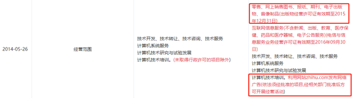 在维护初始调性和牺牲内容质量换流量之间,知乎选择了后者。根据2014年经营范围的变更来看,当时知乎的主要盈利模式还只是广告投放,只有足够大的流量才能保证平台的存活。