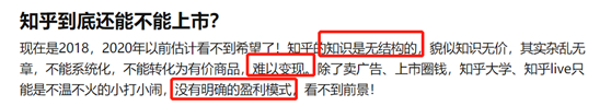得知知乎准备IPO的消息后,几家投行的经理在接受BT财经采访时,也都表示并不看好知乎此次上市的行为,因为并没有了解到知乎有非常明确的盈利模式,而知乎未来的故事也没有让所有的投资人都接受。