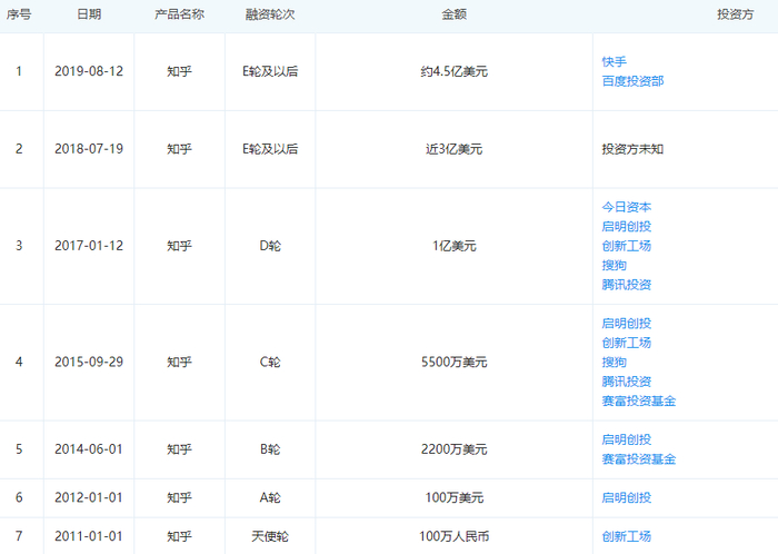 2019年8月12日,知乎完成了4.5亿美元的F轮融资,本轮融资由快手领投、百度跟投,腾讯和今日资本原有投资方继续跟投。