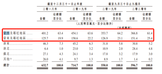 朝聚眼科业务主要集中在内蒙古。招股书显示,2018年至2020年前三季度,来自内蒙古西部、东部及临近地区的营收占其总营收的比例分别为83.3%、85.8%、86.8%。
