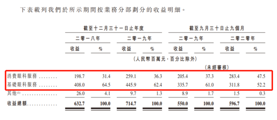 公司由两大业务构成,消费眼科服务和基础眼科服务。其中,消费眼科服务包括屈光矫正(包括老视矫治)、近视防控以及提供视光产品及服务,基础眼科服务包括公共医疗保险计划可能涵盖的白内障、青光眼、斜视、眼底疾病、眼表疾病、眼眶疾病及小儿眼病等多种常见眼科疾病治疗。