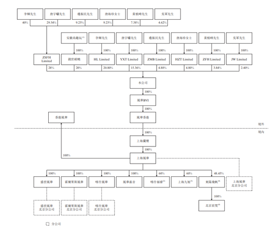 招股书显示,风华秋实在上市前的股东架构中,李辉先生、HL Limited、唐宇啸先生、YXT Limited、边振民先生、ZMB Limited、唐海珍女士、HZT Limited、黄桢峰先生、ZFH Limited、吴军先生、JW Limited 及ZSFH Limited被视为一组本公司之控股股东。