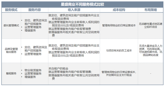 星盛商业服务模式,分三类:委托管理、品牌及管理输出、整租。其中,委托管理服务一直是其收入和利润的主要来源。