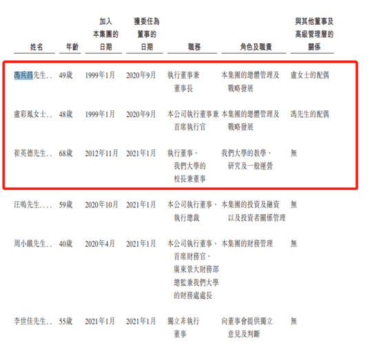 根据公司招股书,冯兵昌为集团董事长兼执行董事;卢彩凤为集团执行董事兼首席执行官;崔英德为集团执行董事兼广州科技职业技术大学校长。其中,冯兵昌、卢彩凤为夫妻,且为公司控股股东,两者拥有集团超30%的表决权。