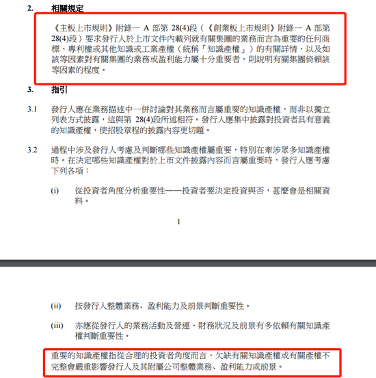 此外,上市科有明确的知识产权披露要求。文件指出,“要求发行人于上市文件内载列就有关集团的业务而言为重要的任何商标、专利权或其他知识或工业产权(统称‘知识产权’)的有关详情,以及如 该等因素对有关集团的业务或盈利能力属十分重要者,则说明有关集团倚赖该 等因素的程度。”