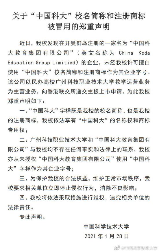1月26日,“中国科大教育集团有限公司”提交赴港上市申请书,27日,中国科大新创校友基金会直接怒怼,并呼吁相关方确保其上市失败。中国科大官方也发布声明,拟追究相关公司法律责任。