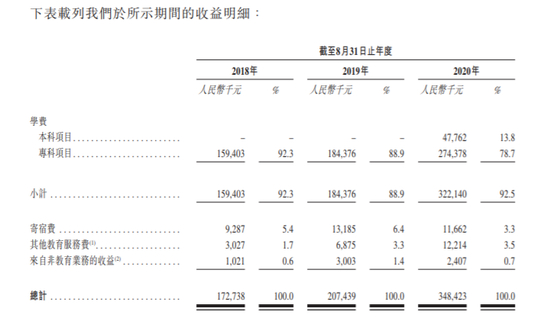 收益方面来看,公司截至8月31日止年度在2018年-2020年收入分别为1.73亿元、2.07亿元以及3.48亿元。公司主要依赖专科学费收入,在学费收入中,2020年度本科项目收入0.48亿元,占比13.8%,专科项目收入2.74亿元,占比近80%。
