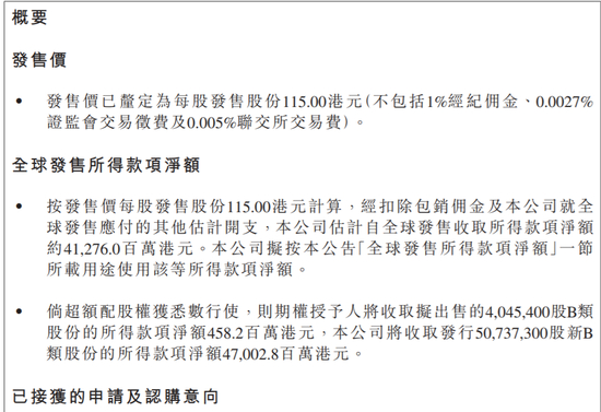 国际发售初步提呈发售的发售股份获大幅超额认购,相当于国际发售初步可供认购发售股份总数约39倍。国际发售的发售股份最终数目为3.43亿股B类股份,相当于全球发售初步可供认购发售股份总数约94.0%(未行使超额配股权)。由于公开发售触发回拨机制,导致国际配售数目从3.561亿股减少为3.43亿股。