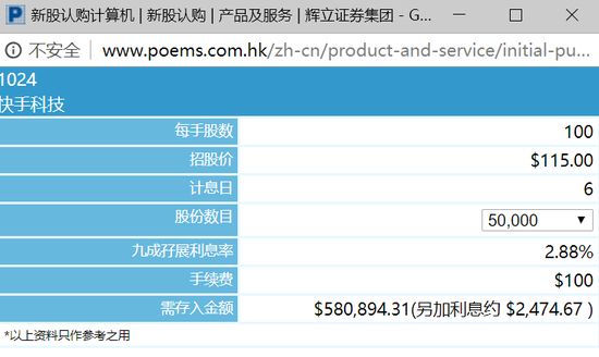 根据快手火热程度,公司大概率以上限115港元定价,如果申购一手中签一手,入场费+手续费+孖展利息合计220.83港元,需要快手涨2%。按今日预热盘价格265.4港元计算,一手赚港元,一手净赚1.48万港元。