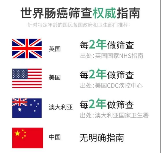 中国多项有关癌症筛查的指引,如中华医学会于2020年6月刊发的《中国结直肠癌早诊早治专家共识》、11个研究机构及协会于2019年10月刊发的《中国早期结直肠癌筛查流程专家共识意见》、北京健康管理协会于2018年11月刊发的《防癌体检规范专家共识》、中国抗癌协会于2018年10月刊发的《中国结直肠肿瘤早诊筛查策略专家共识》等文件都指出,建议每年或每三年进行一次结直肠癌筛查。由于表现可靠及使用方便,多靶点粪便FIT-DNA测试(常卫清)被认为是目前最佳的非侵入性结直肠癌筛查技术。