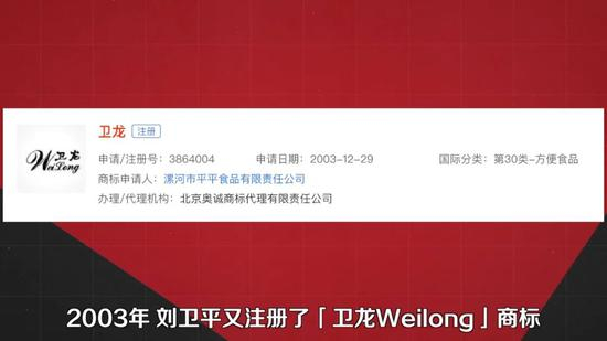 2003年,刘卫平又注册了‘卫龙Weilong’商标,就像老婆饼里没有老婆,凤爪不是凤凰的爪子,卫龙辣条里也没有龙。