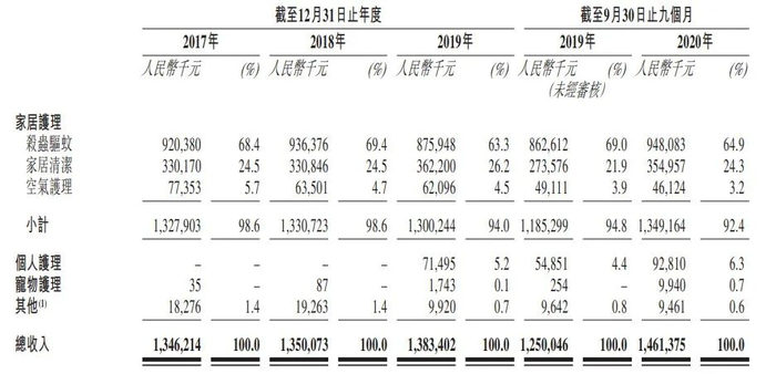 其中,杀虫驱蚊、家居清洁、空气护理均属于家居护理,该板块是朝云集团的主要营收来源。数据显示,2017年、2018年、2019年与2020年前三季度,家居护理板块营收分别为1.32亿元、1.33亿元、1.30亿元、0.68亿元。
