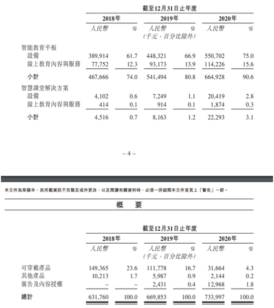 招股书显示,读书郎智能教育平板于2018年、2019年及2020年的总出货量分别为39.96万台、45.69万台及48.46万台,同期来自该等产品的收入分别为人民币4.68亿元、人民币5.42亿元及人民币6.65亿元,零售价主要介乎人民币2,900元至人民币5,000元。