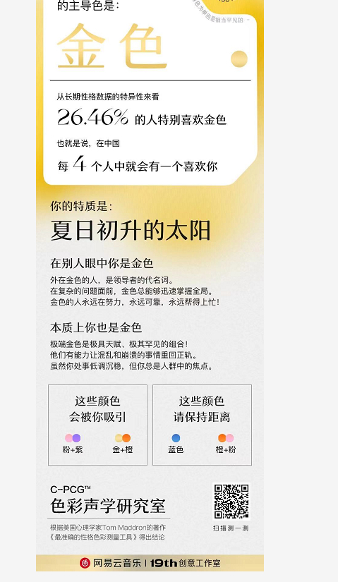 众人争相围观的几个小时内,战场从朋友圈到微博广场,从个人性格颜色分享到全民联欢,网易云通过撬动网友们的狂欢神经,完成了品牌价值的一次重要输出,一场教科书式的营销。