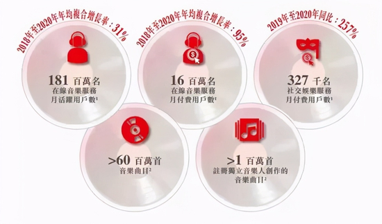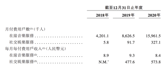 会员人数方面,招股书公开信息,网易云近三年月活跃用户数为2018年1亿、2019年1.47、2020年1.8亿,三年增幅为71.4%。近三年月付费用户数为2018年420万人、2019年860万人、2020年1600万人,三年增幅281%。近三年社交娱乐服务月付费用户数为2018年0.58万、2019年9.17万、2020年32.7万人,三年增幅高达5538%。